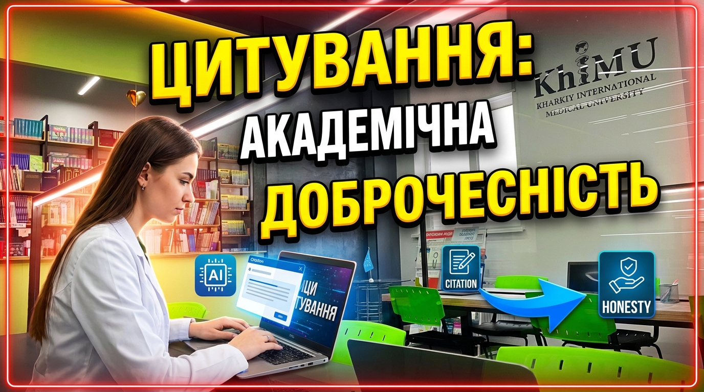 Чернишенко Н. Академічна доброчесність і цитування | Ванкуверський стиль для медиків [Електронний ресурс] : відеоогляд / уклад. Бібліотека ХММУ. — Електрон. відеодані. — Харків : ХММУ, 2026. — 1 відеофайл. — (Серія «На допомогу студенту та науковцю»). — Режим доступу: https://www.youtube.com/watch?v=royeKO4QHKQ. — Назва з екрана.