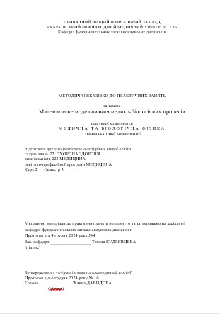 Арсен’єв, О. Математичне моделювання медико-біологічних процесів : методичні вказівки до практичних занять освітньої компоненти "Медична та біологічна фізика" [Електронний ресурс] / О. Арсен’єв; Приватний вищий навчальний заклад «Харківський міжнародний медичний університет». – Харків, 2024. – 6 с.
